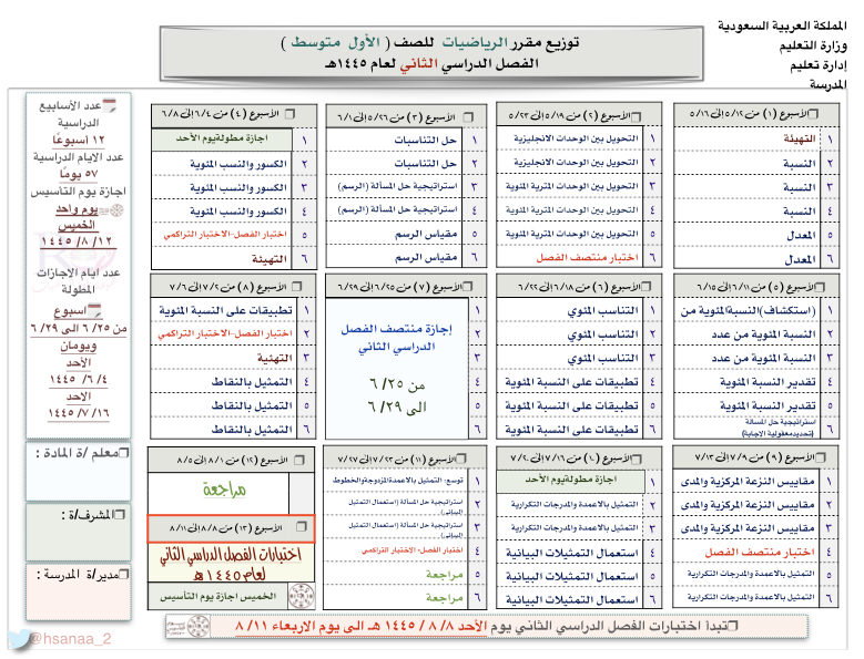 توزيع منهج الفصل الدراسي الثاني للصف الأول متوسط