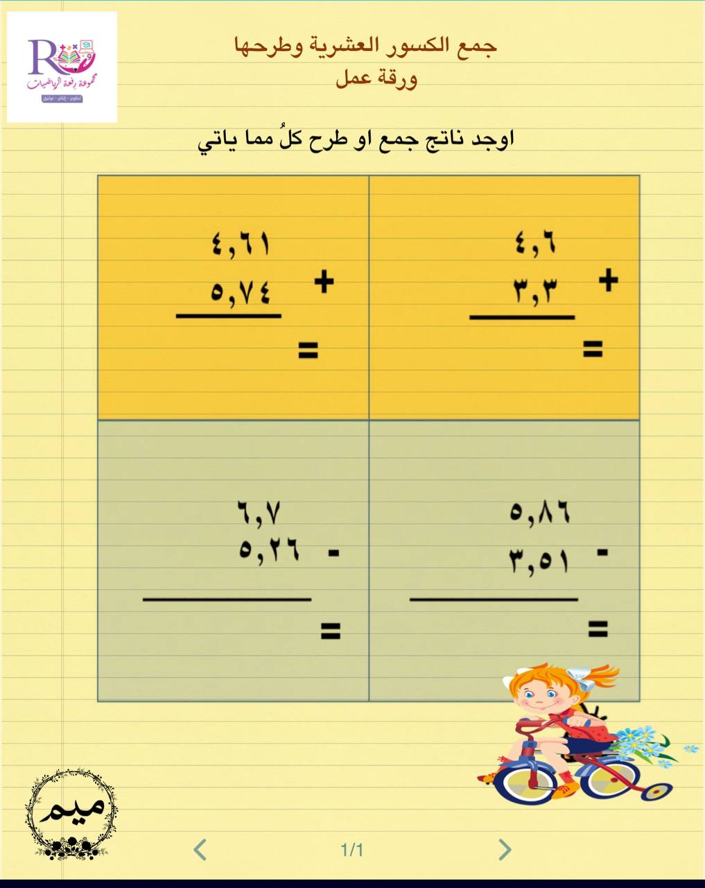 ورقة عمل درس جمع الكسور العشرية وطرحها pdf