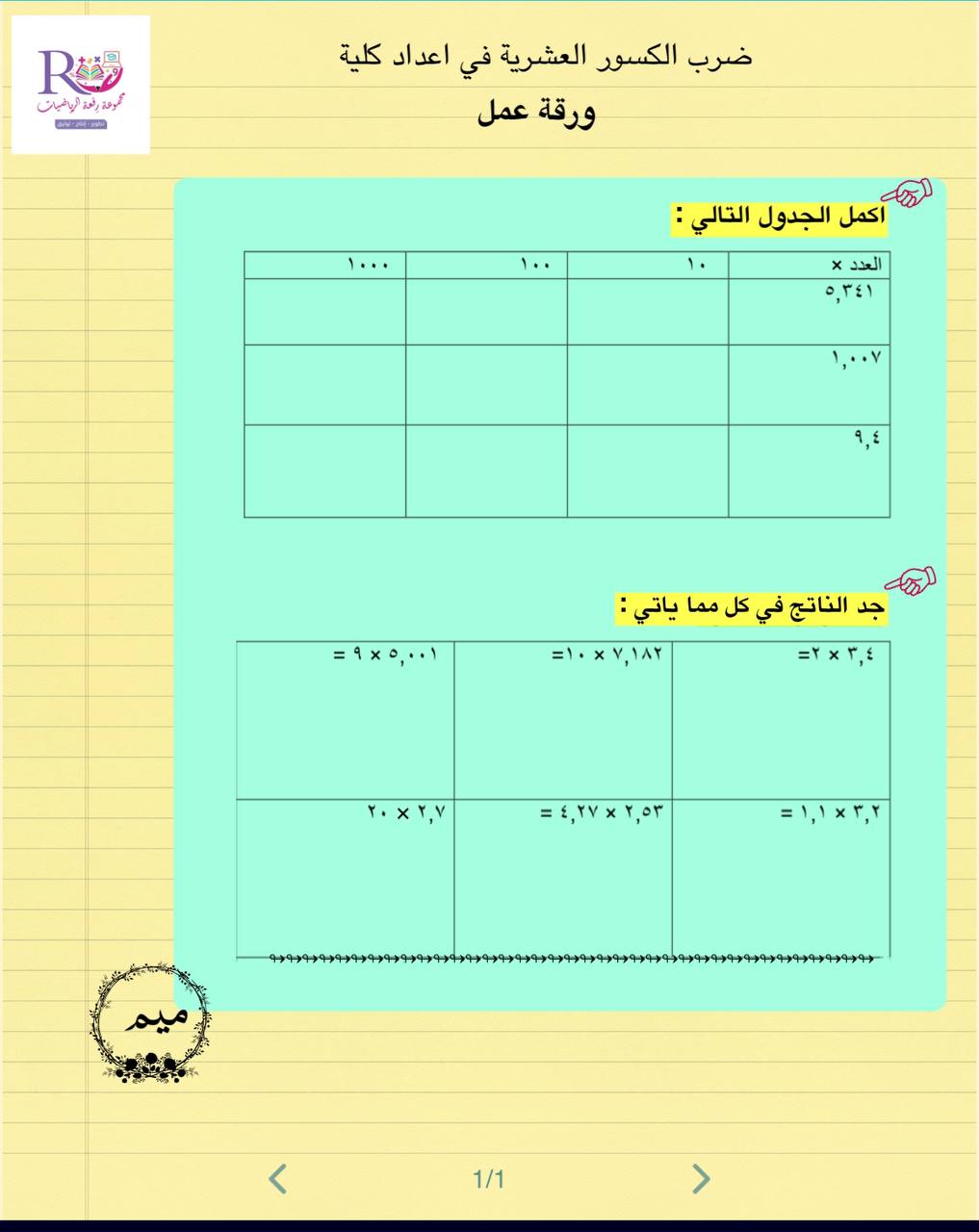 ورقة عمل لدرس ضرب الكسور العشرية في اعداد كلية pdf