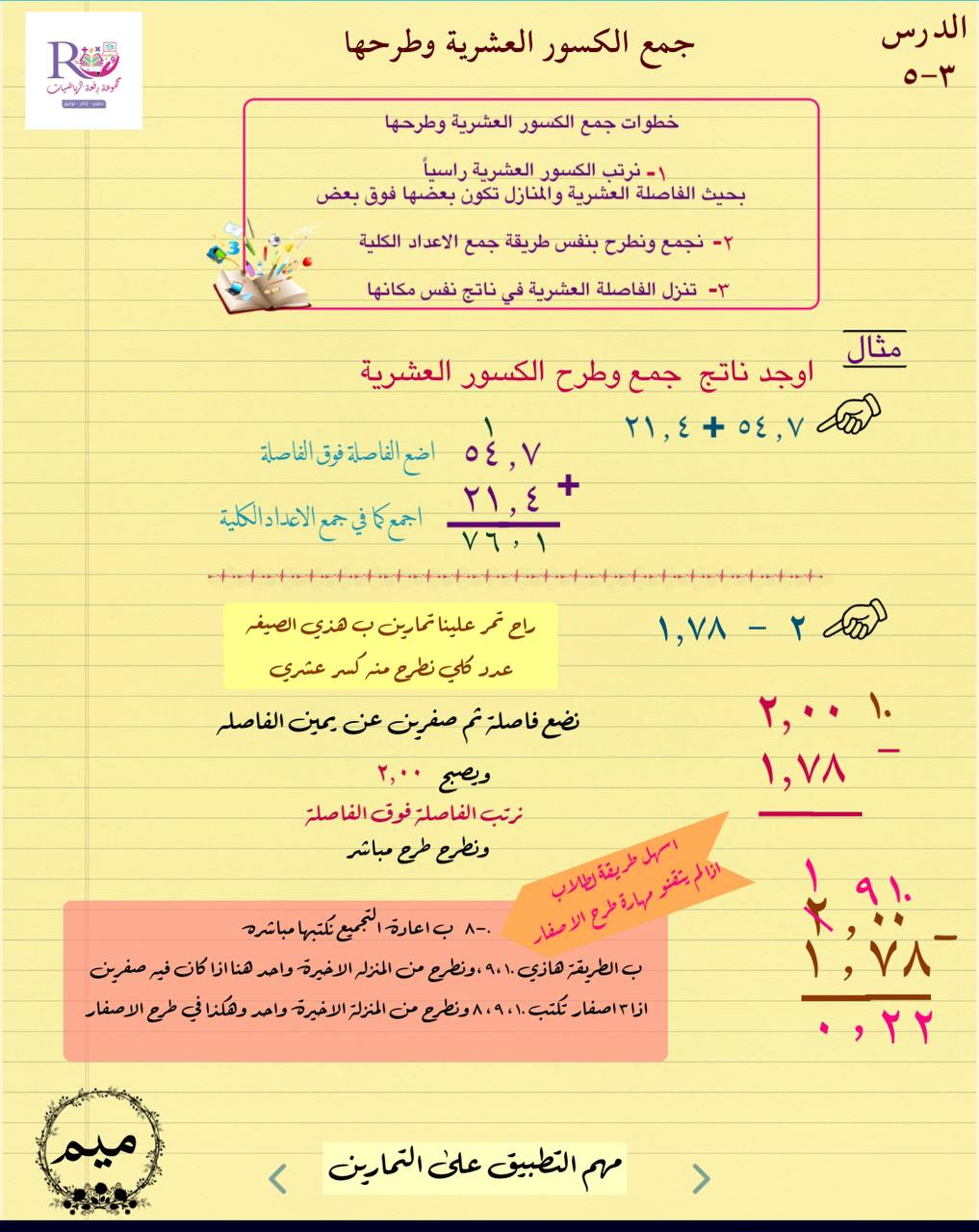 ملخص درس جمع الكسور العشرية وطرحها pdf أ\م مريم الغامدي