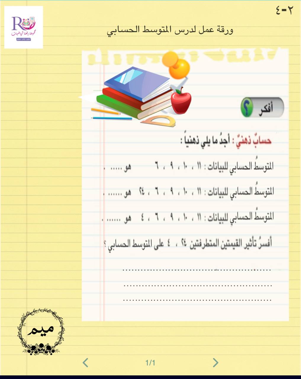 ورقة عمل درس المتوسط الحسابي أ/ مريم الغامدي