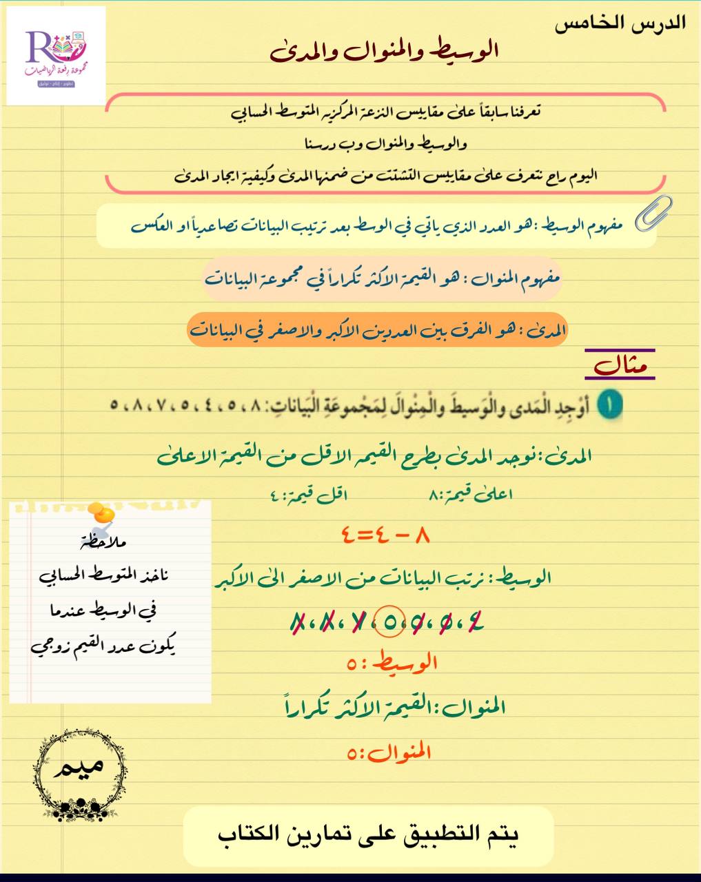 ورقه عمل درس الوسيط والمنوال والمدى