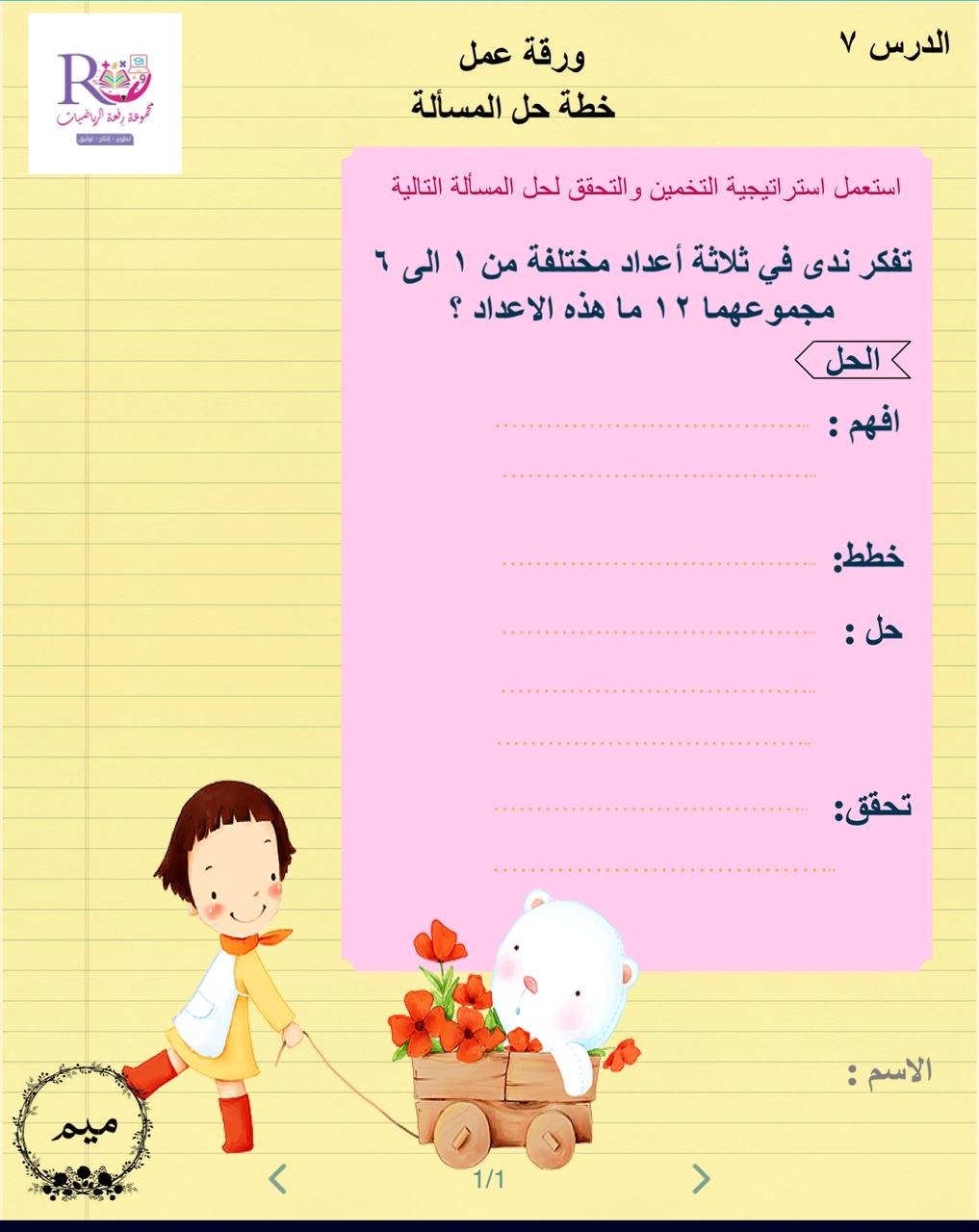 ورقة عمل لدرس خطة حل المسألة التخمين والتحقق