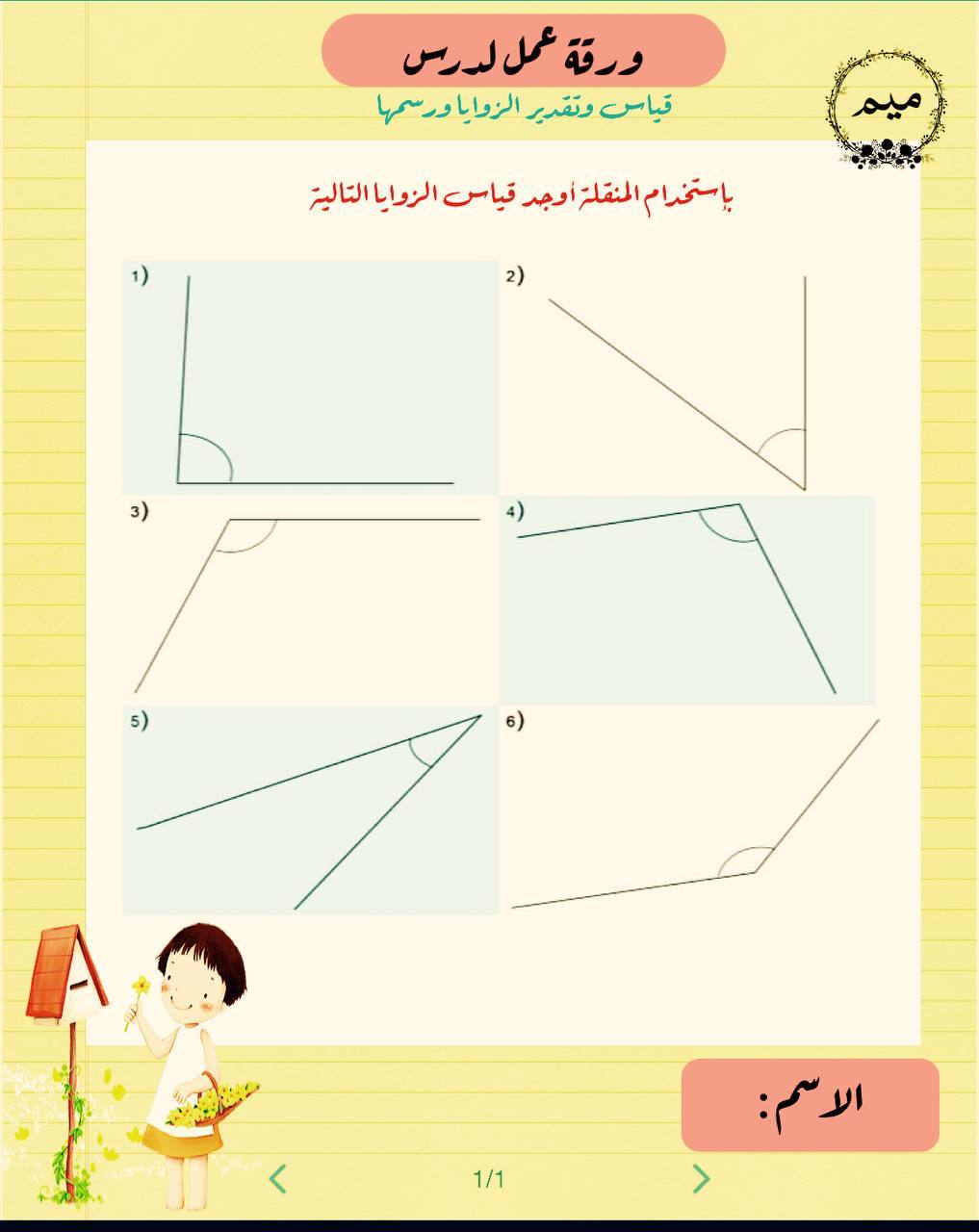 ورقـة عــمــل لدرس قياس وتقدير الزوايا ورسمها أ/مريم الغامدي