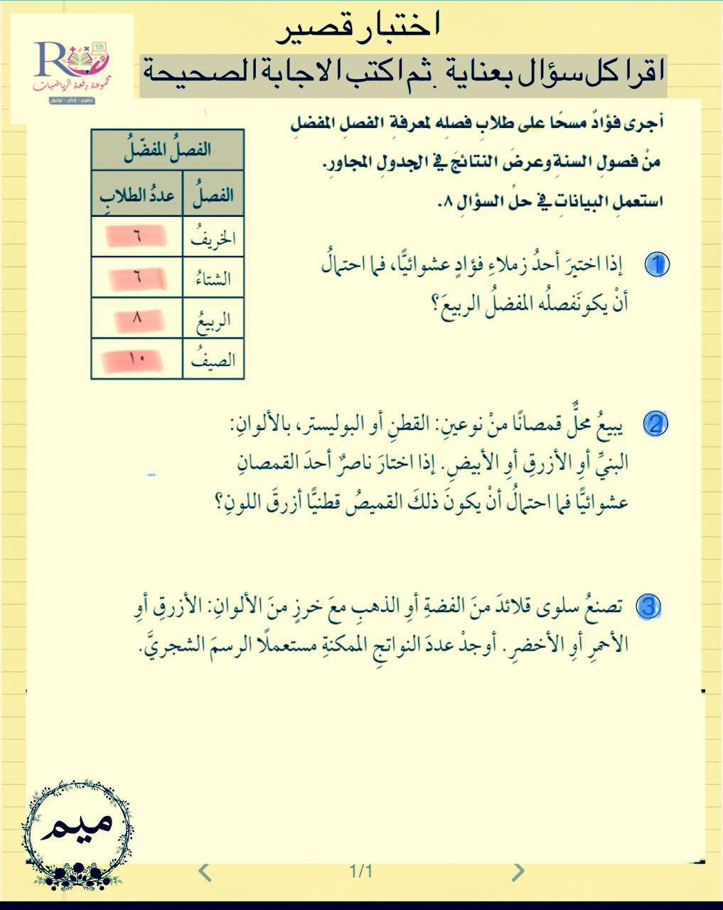 اختبار قصير علي درسي الاحتمال و فضاء العينة
