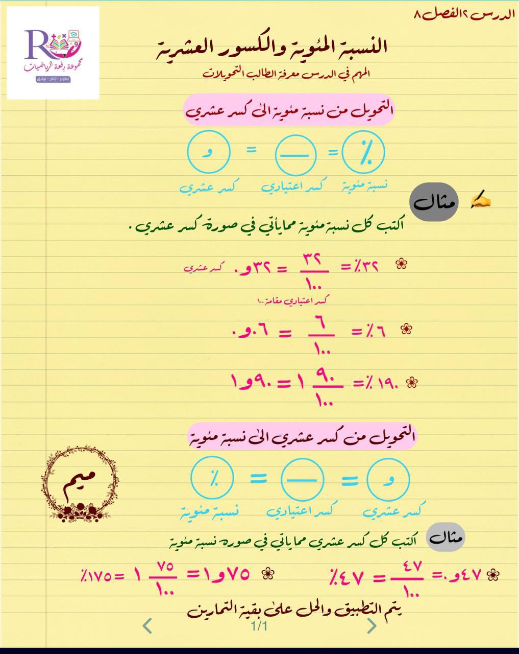 ملخص درس النسبة المئوية والكسور العشرية أ/مريم الغامدي