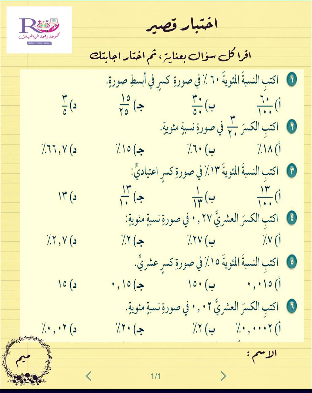 اختبار قصير ..في درسي النسبة المئوية والكسور العشرية والاعتيادية