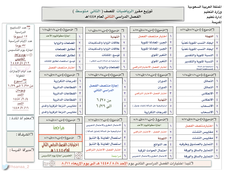 توزيع منهج الفصل الدراسي الثاني للصف الثاني متوسط