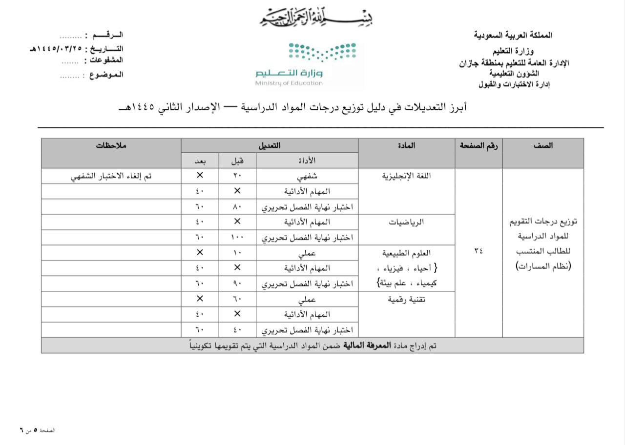 دليل توزيع درجات المواد الدراسيه الاصدار الثاني