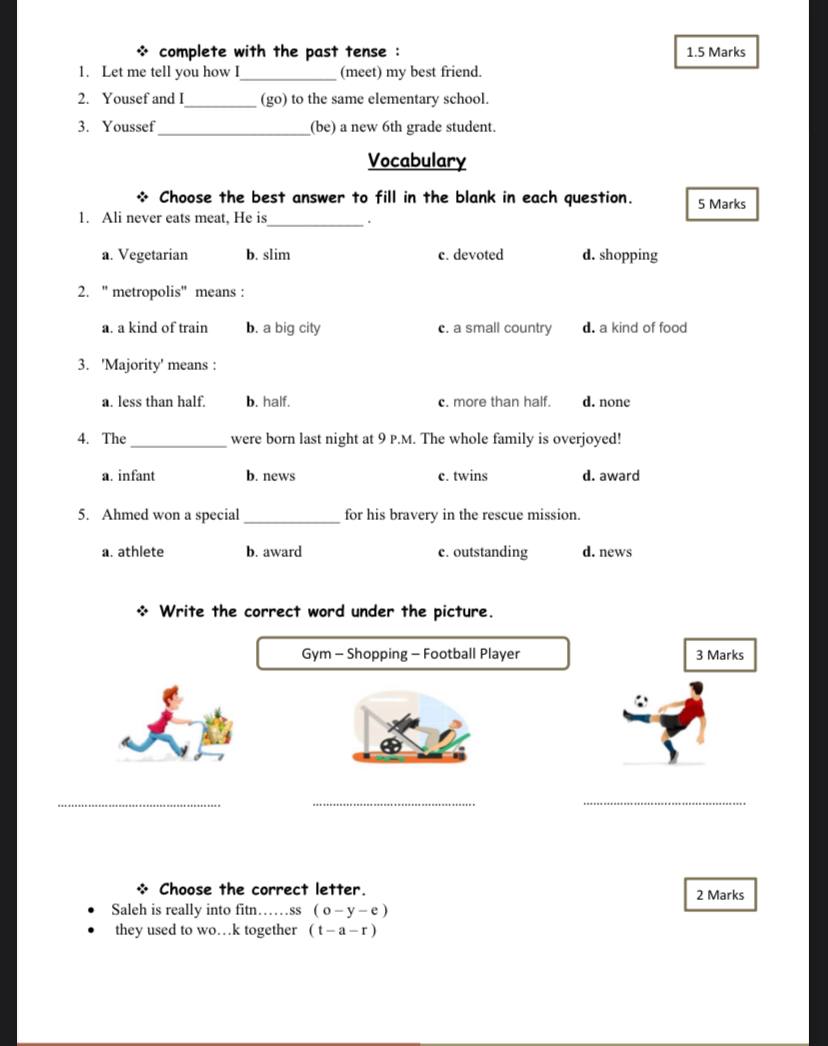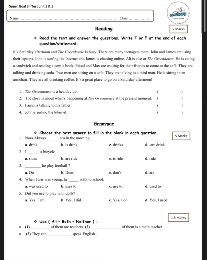 اختبار علي الوحده الاولي SG 3 Unit 1 pdf