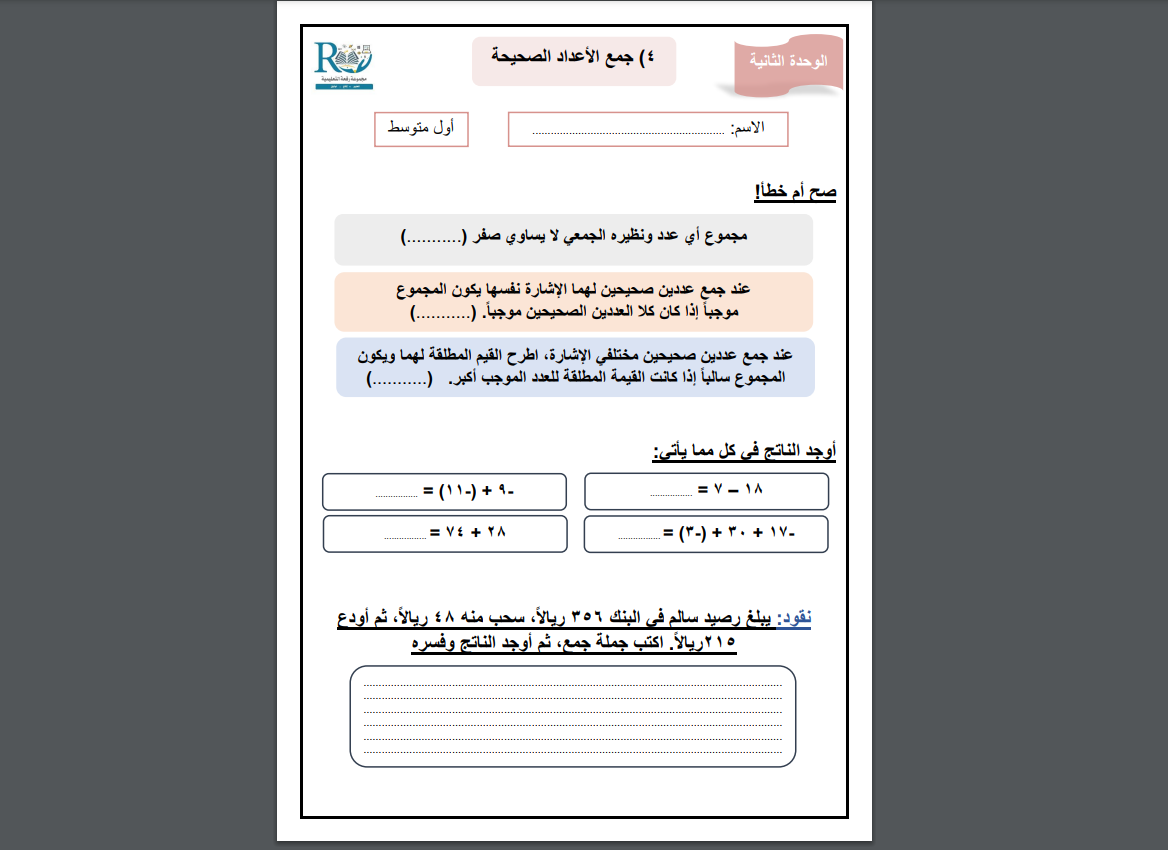 ورقة عمل لدرس جمع الأعداد الصحيحة
