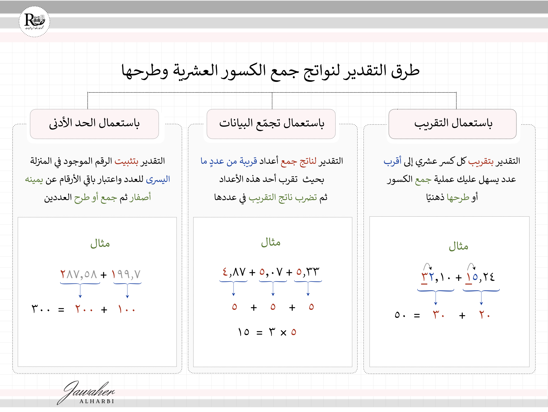 *خارطة مفاهيم طرق التقدير لنواتج جمع الكسور العشرية وطرحها