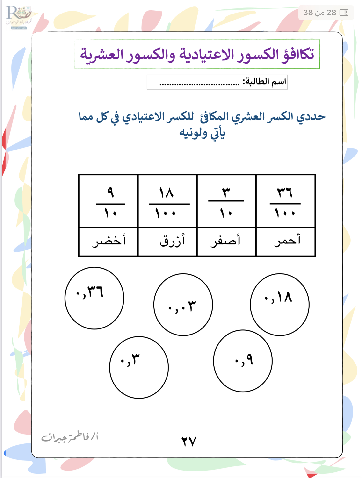 ورقة عمل ( تكافؤ الكسور الاعتيادية والكسور العشرية)