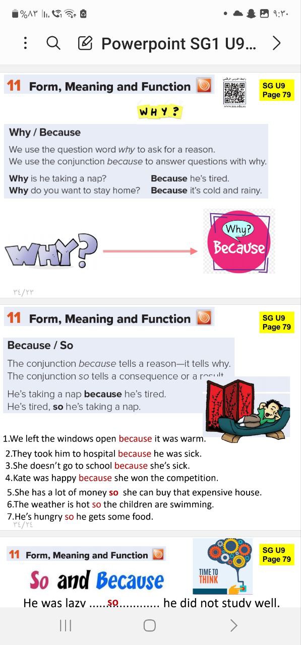 ورقه عمل للوحده التاسعه (work sheet so because Powerpoint SG1 U9 Form meaning) pdf أ/نوريه