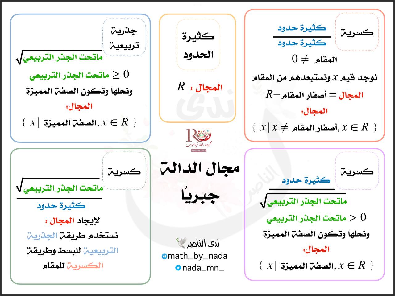 تصميم يوضح أنواع الدوال وطريقة تحديد المجال لها .