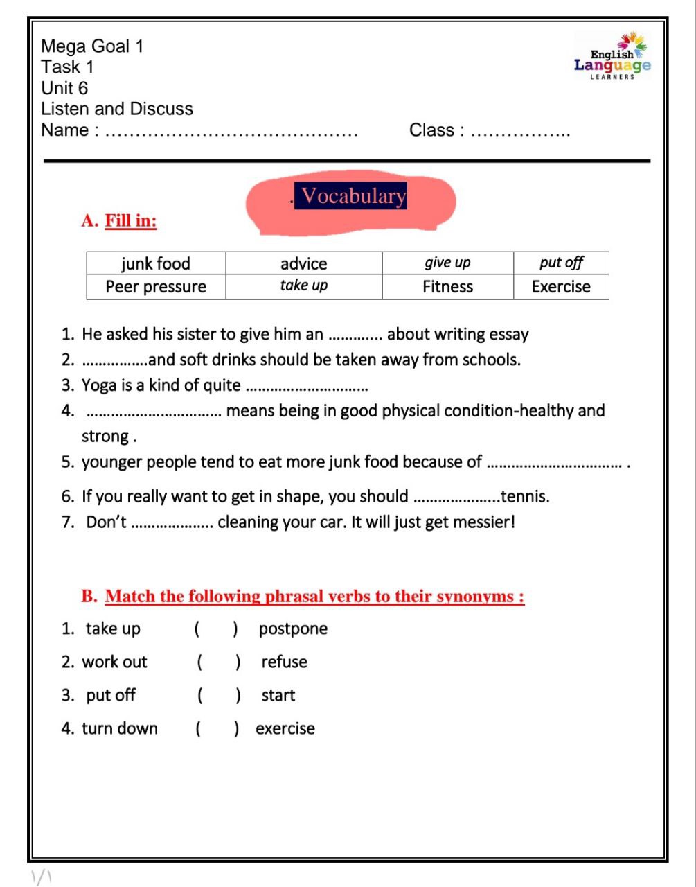 ورقه عمل للوحده االساسهMega Goal 2.2 Unit 6 Revision Worksheet N (baron)