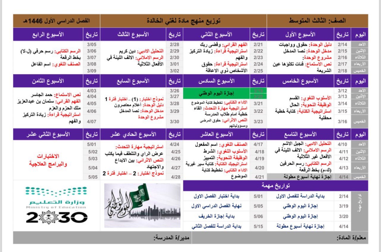 توزيع منهج لغتي ثالث متوسط الفصل الأول ١٤٤٦