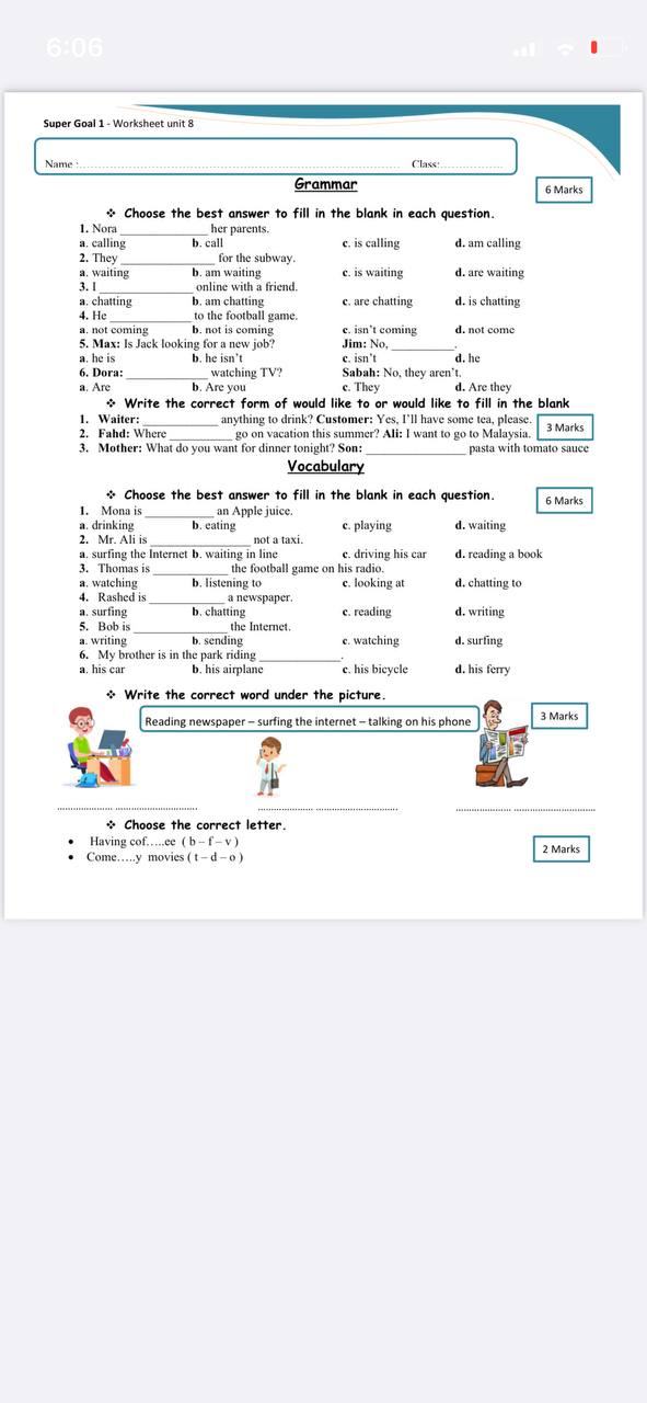ورقه عمل للوحده الثامنه worksheet Unit 8 -pdf