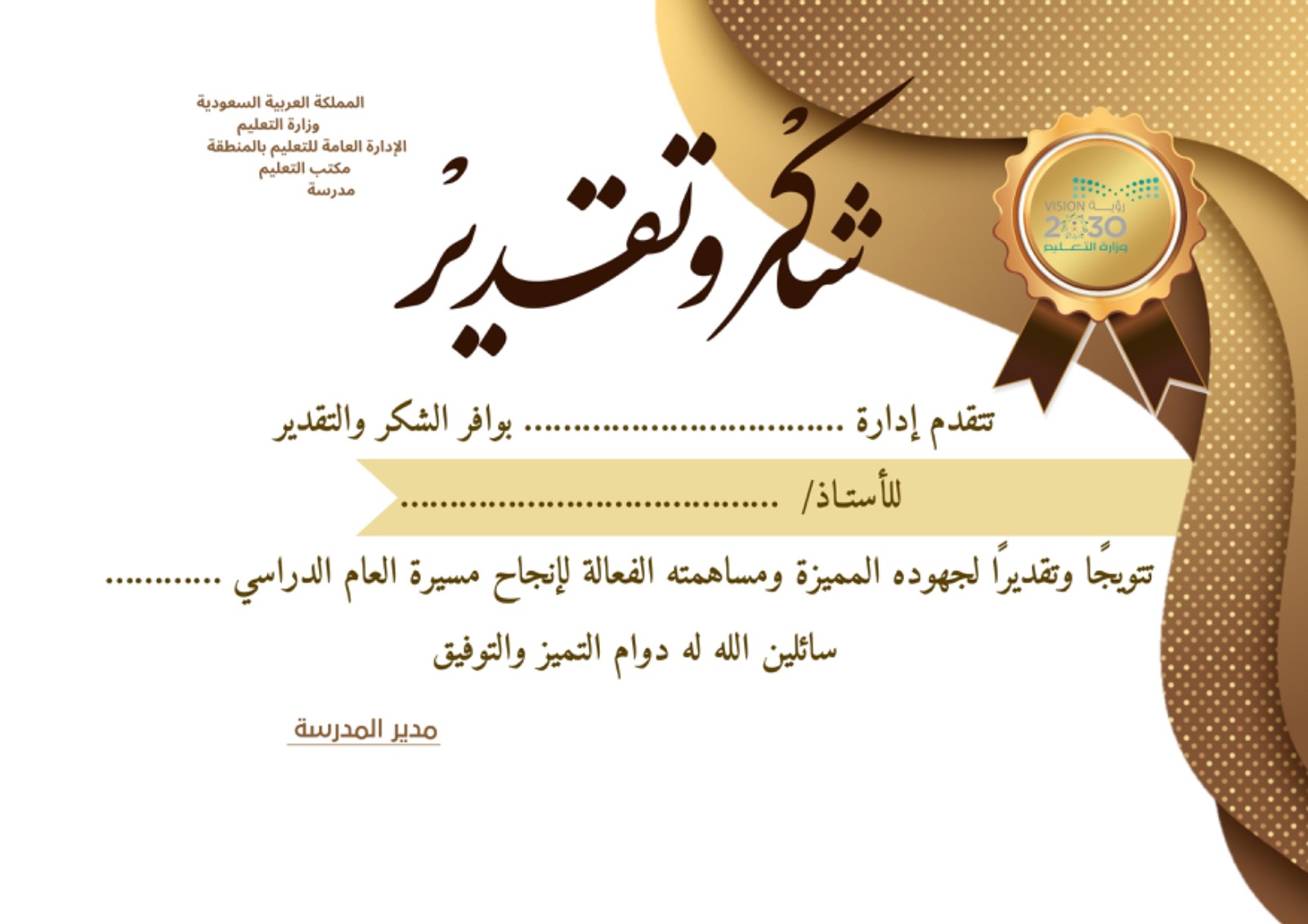 شهادة شكر وتقدير للأساتذة نموذج1