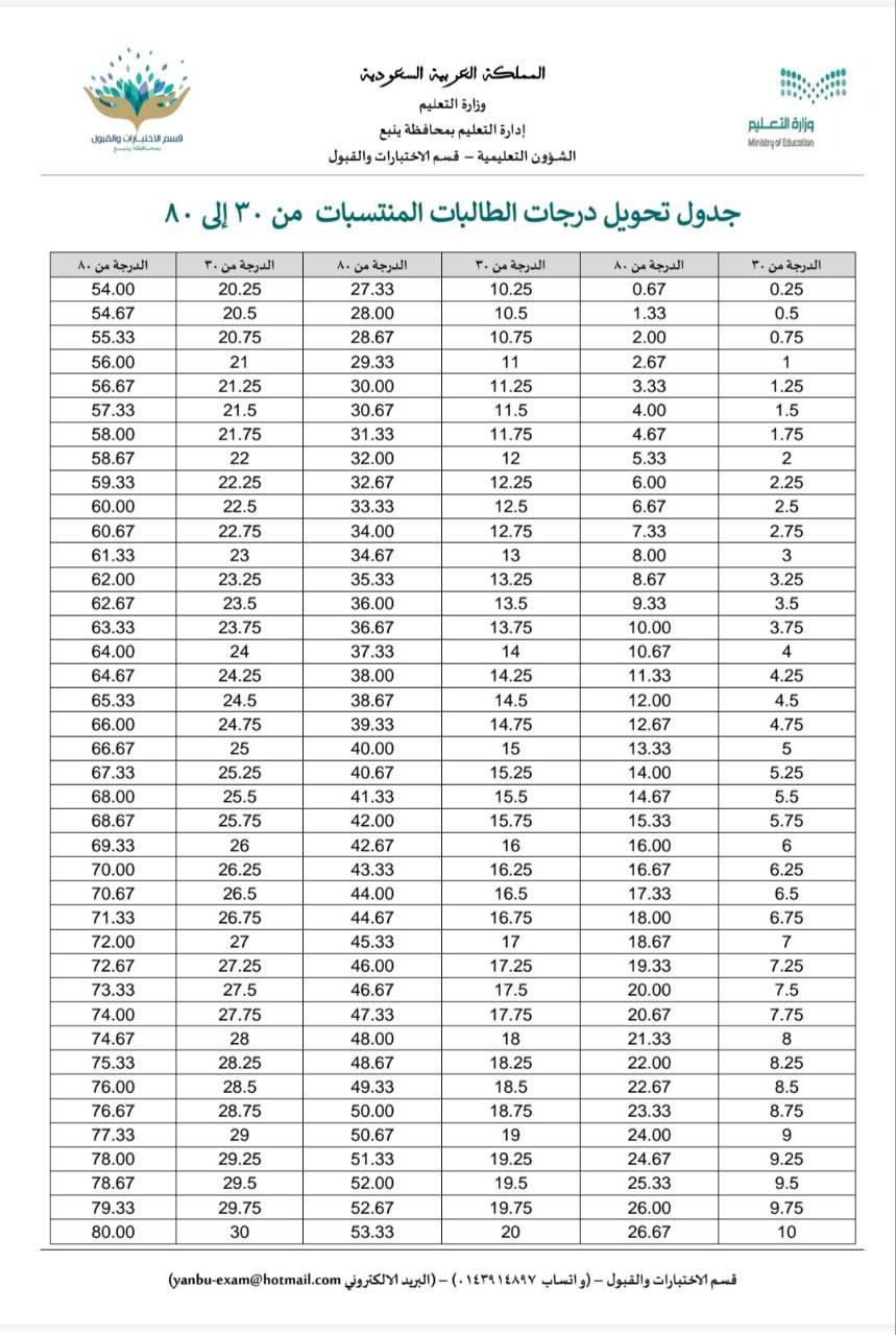 Table of conversion of female students' grades from 30 to 80