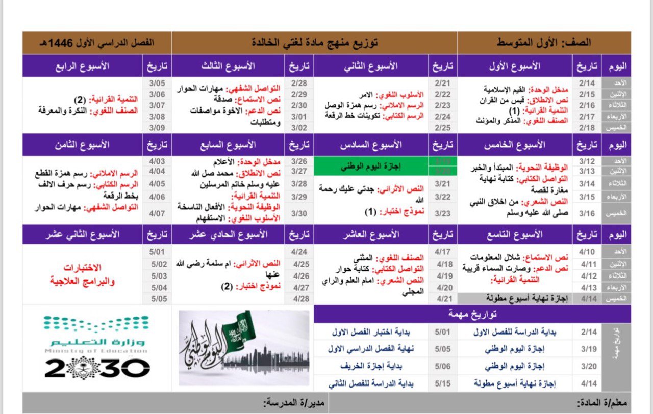 توزيع منهج لغتي أول متوسط ١٤٤٦