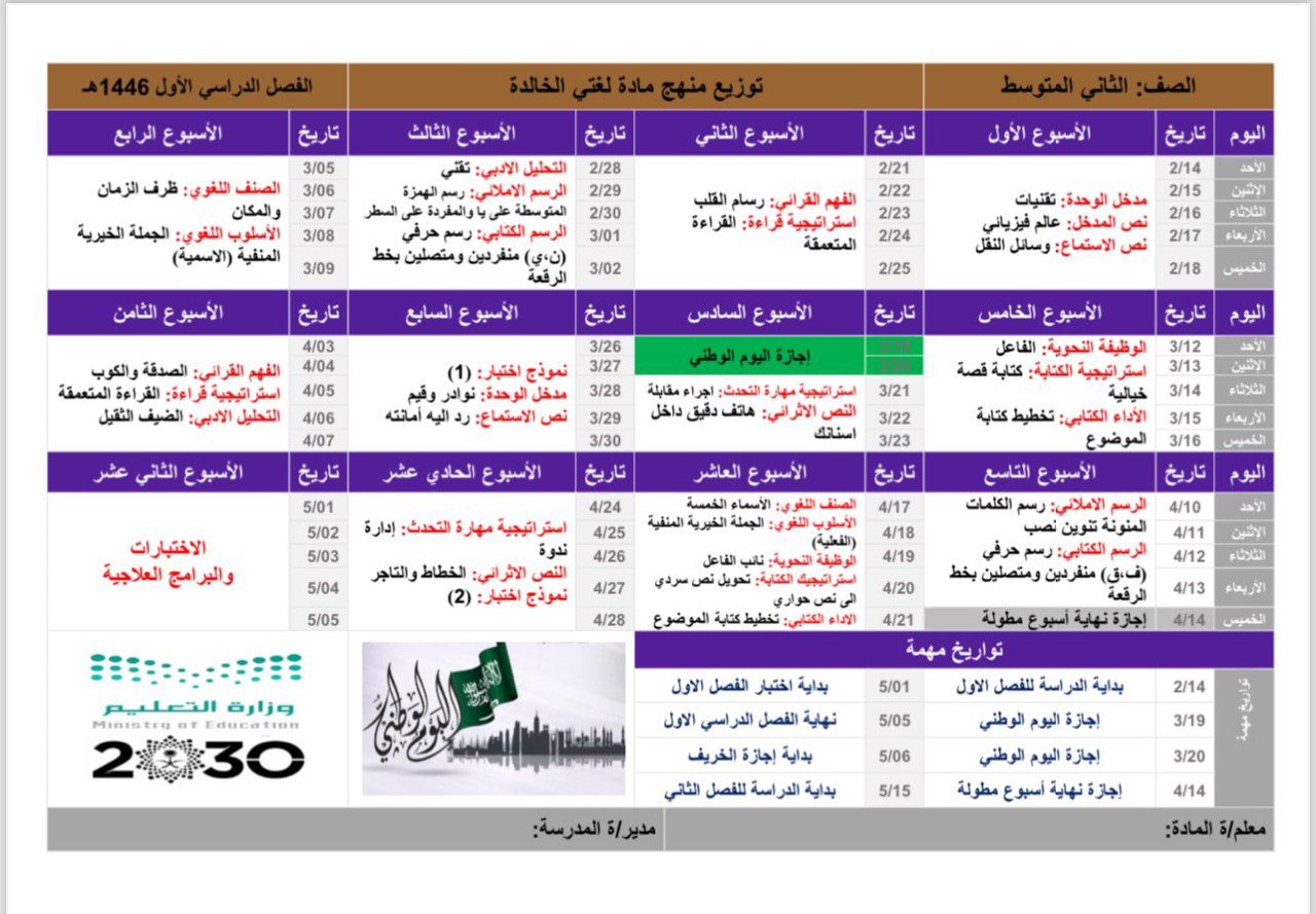 توزيع منهج لغتي ثاني متوسط الفصل الاول١٤٤٦