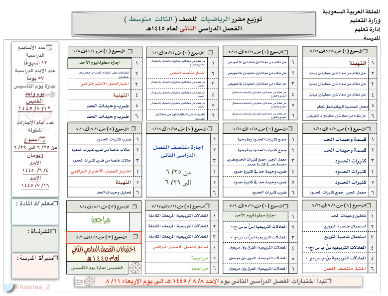 توزيع منهج الفصل الدراسي الثاني للصف الثالث متوسط