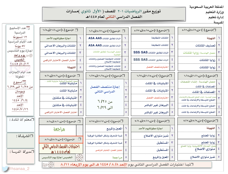 توزيع منهج الفصل الدراسي الثاني للصف الاول ثانوي