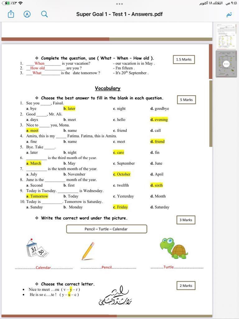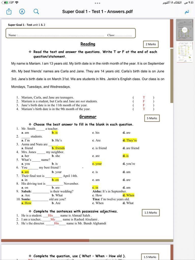 اختبار للصف الاول متوسط بالاجابات