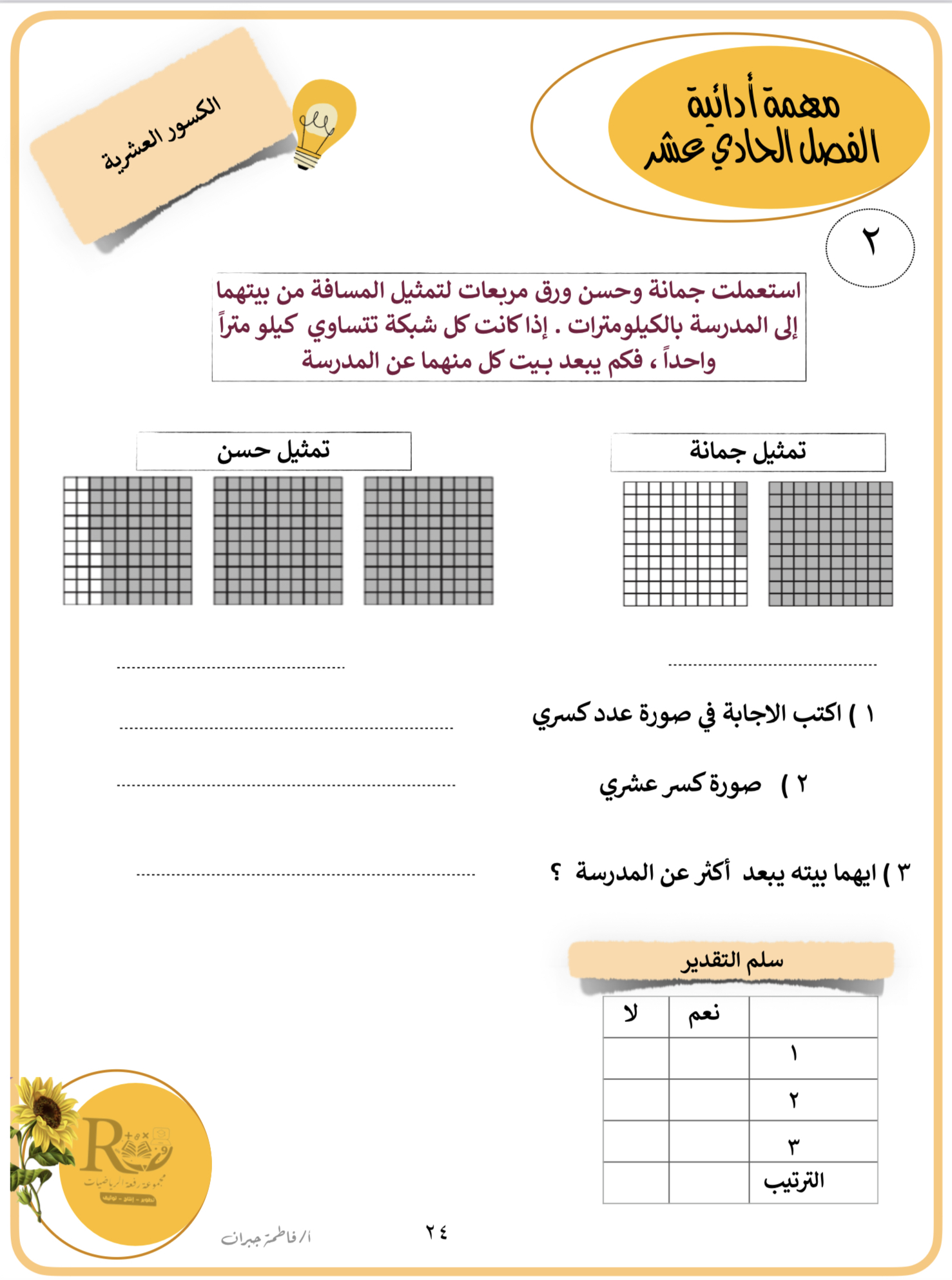 مهمة ادائية ٢ الفصل ١١ ( الكسور العشرية )