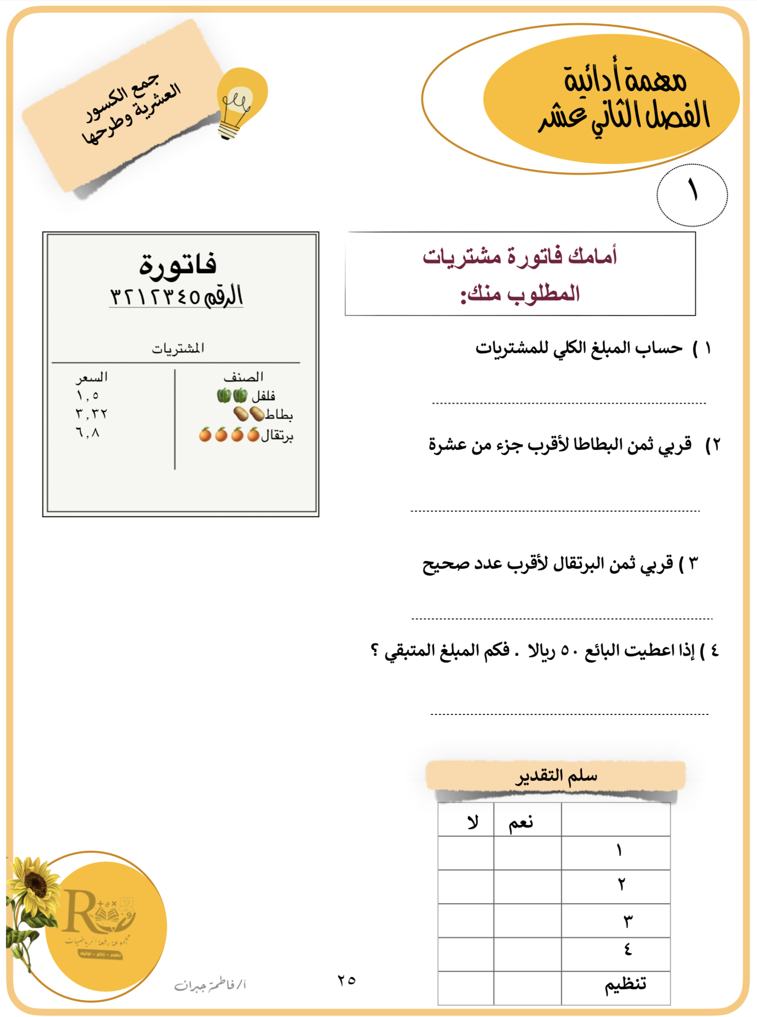 مهمة ادائية ١ الفصل ١٢ ( جمع الكسور العشرية وطرحها)